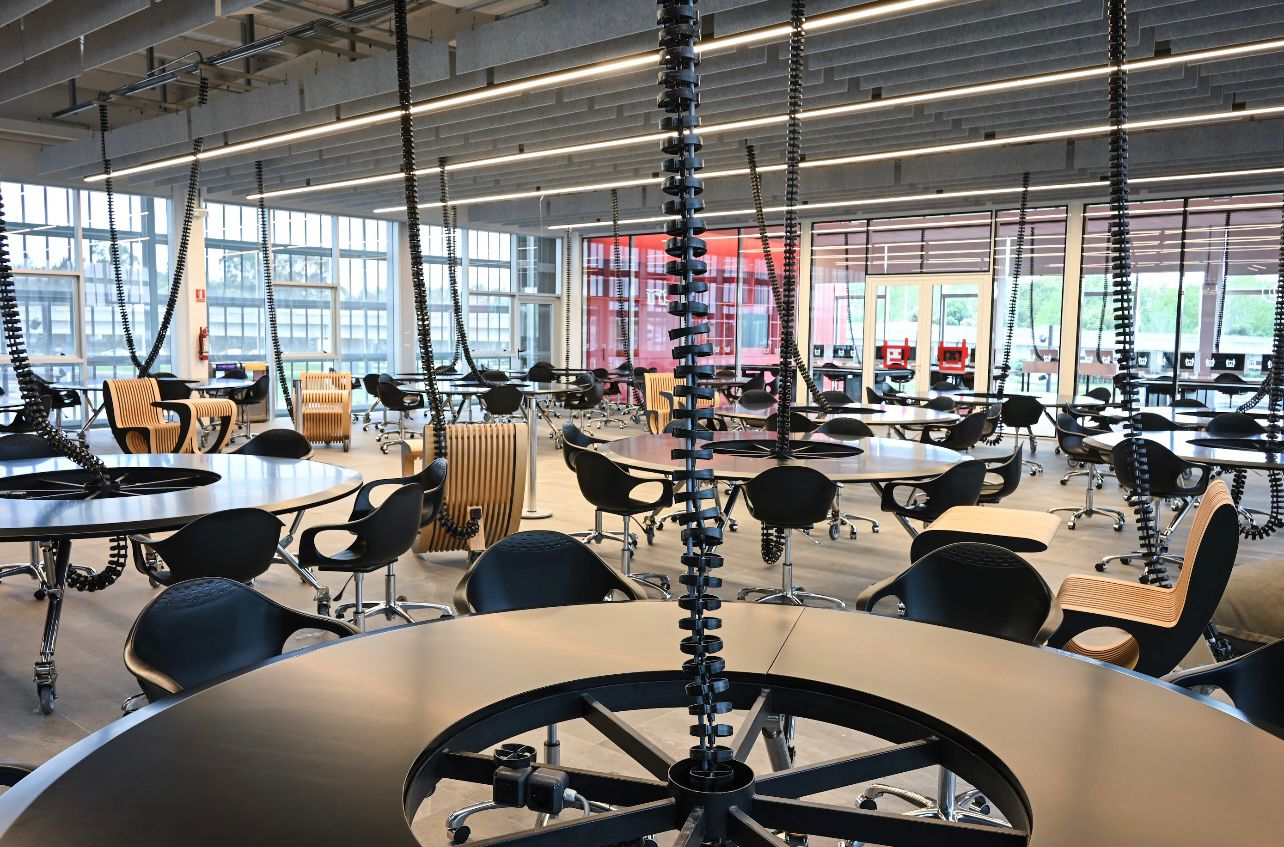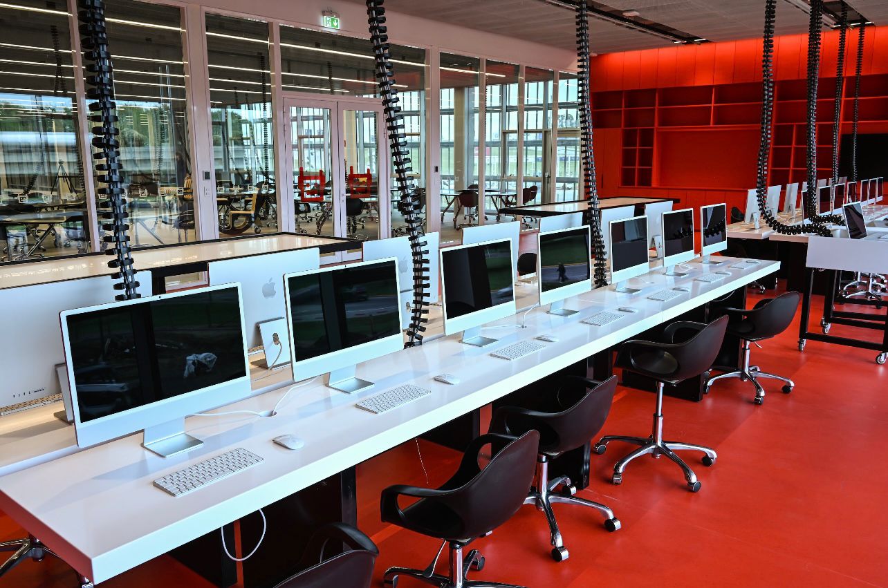 El diseño arquitectónico contempla espacios abiertos y una gran escalera central como punto de encuentro, fomentando la interacción entre los estudiantes. Incluye una amplia sala de autoaprendizaje, una sala de robótica, espacios para talleres, un estudio de música con sala de control, sala de ensayo y sala de grabación.